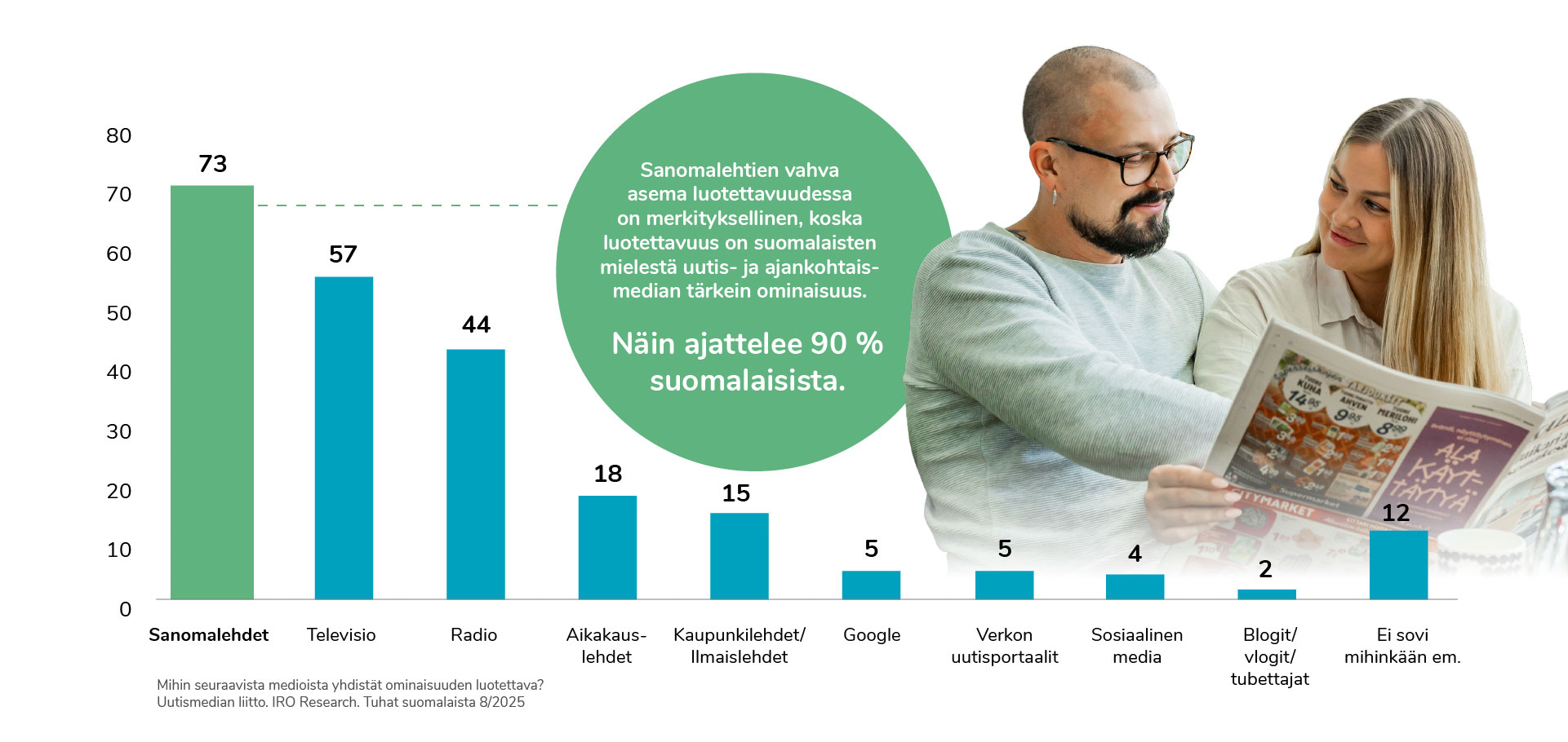 Sanomalehtiä pitää luotettavana 77 prosenttia suomalaisista, Googlea viisi prosenttia ja sosiaalista mediaa kolme prosenttia. Luotettavuus on suomalaisten mielestä uutismedian tärkein ominaisuus ja tähän kotimainen uutismedia pyrkii vastaamaan.