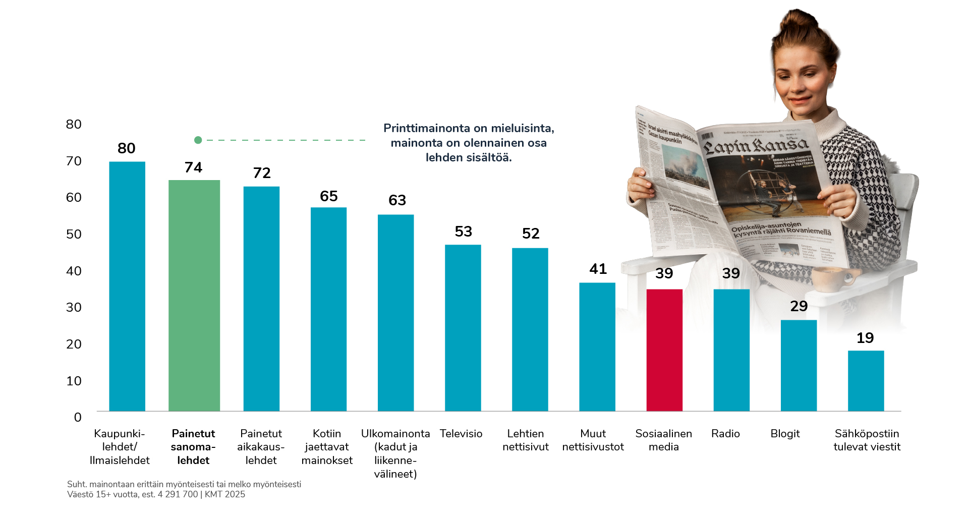 Alle puolet väestöstä suhtautuu mainontaan sosiaalisessa mediassa myönteisesti, tämä koskee myös sosiaalisen median aktiivikäyttäjiä. Televisiossa tai lehtien nettisivuilla olevaan mainontaan suhtautuu positiivisesti yli puolet väestöstä, painetuissa sanomalehdissä 77 prosenttia.